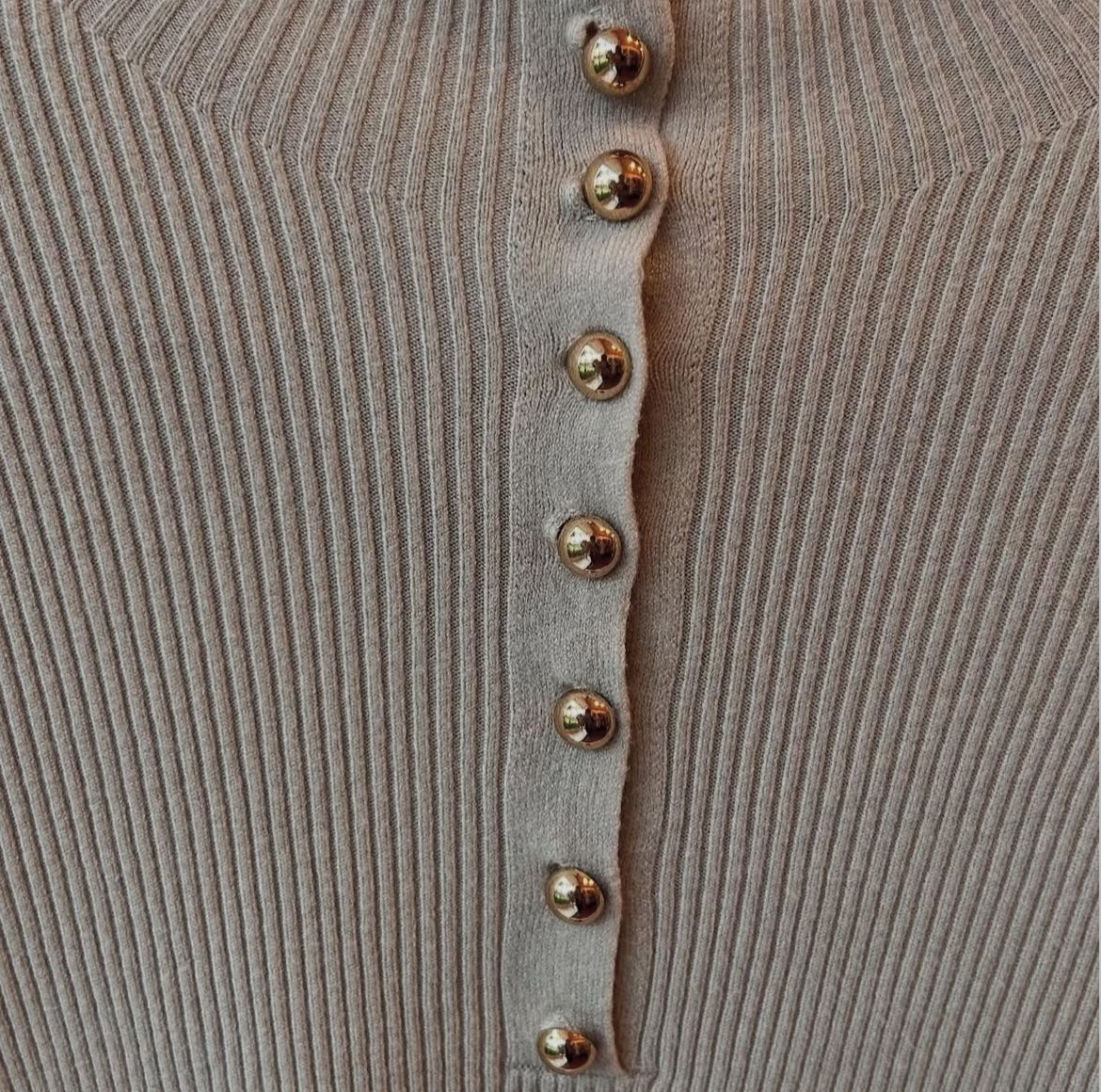 Designed with a clean U-neckline and tailored silhouette, accented by structured front pockets and refined gold-tone buttons. The ribbed hem enhances shape while maintaining comfort and flexibility.