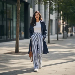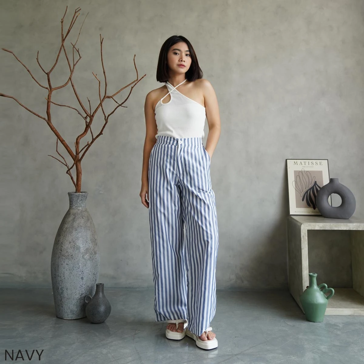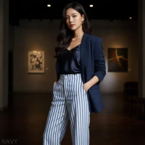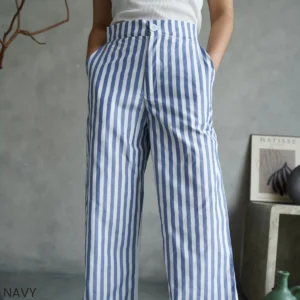 Tampil stylish & nyaman dengan celana kulot garis navy! Desain lebar yang chic, mudah dipadukan untuk segala aktivitas. Wajib punya untuk OOTD modismu! #CelanaKulot #CelanaGaris #FashionWanita