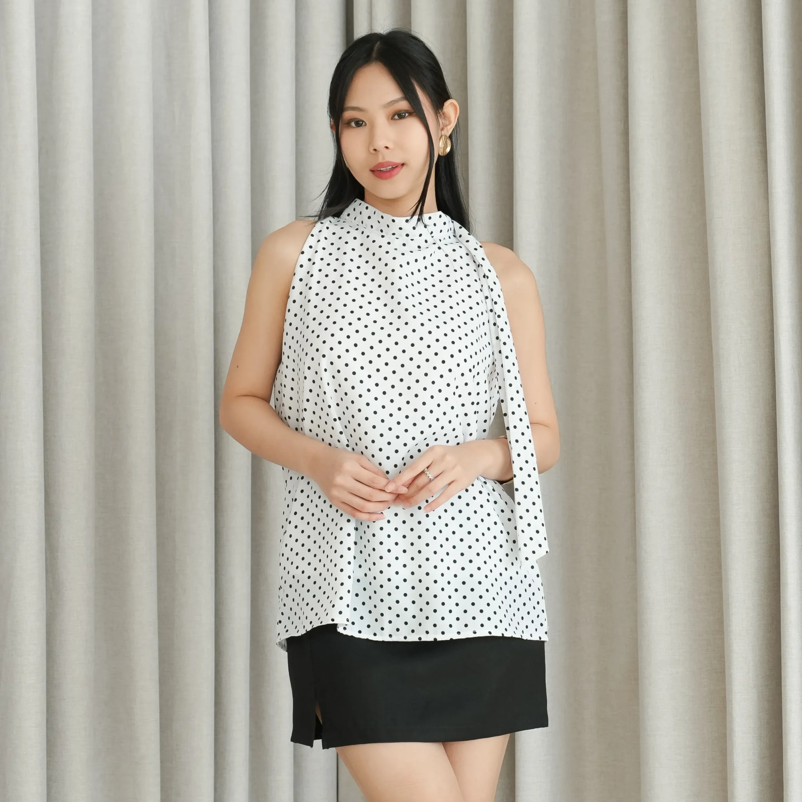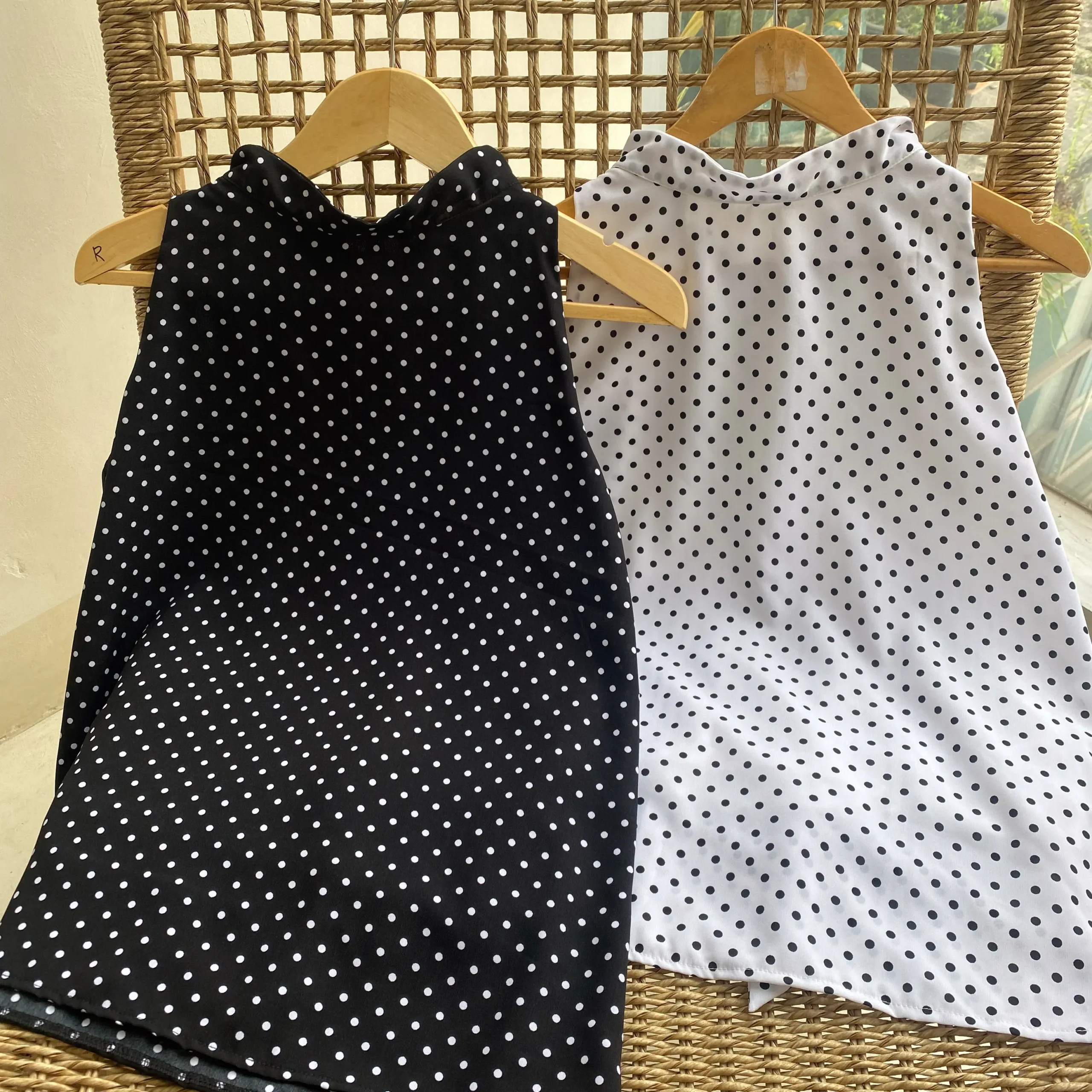 Tampil chic dengan Blouse Atasan Polkadot Tanpa Lengan! Desain kerah tinggi klasik yang timeless, hadir dalam pilihan warna hitam & putih.