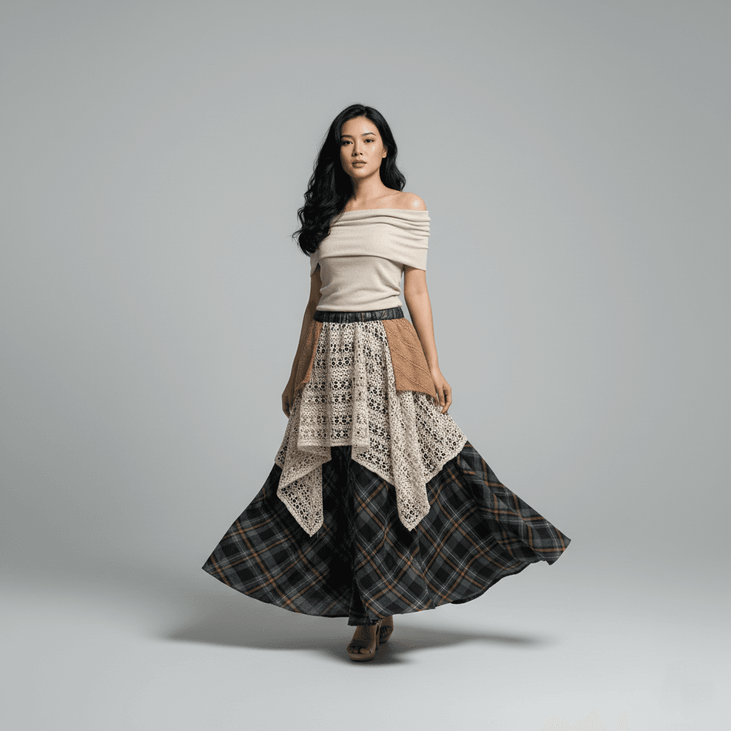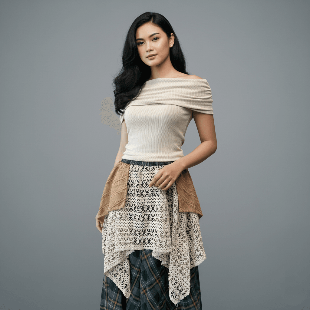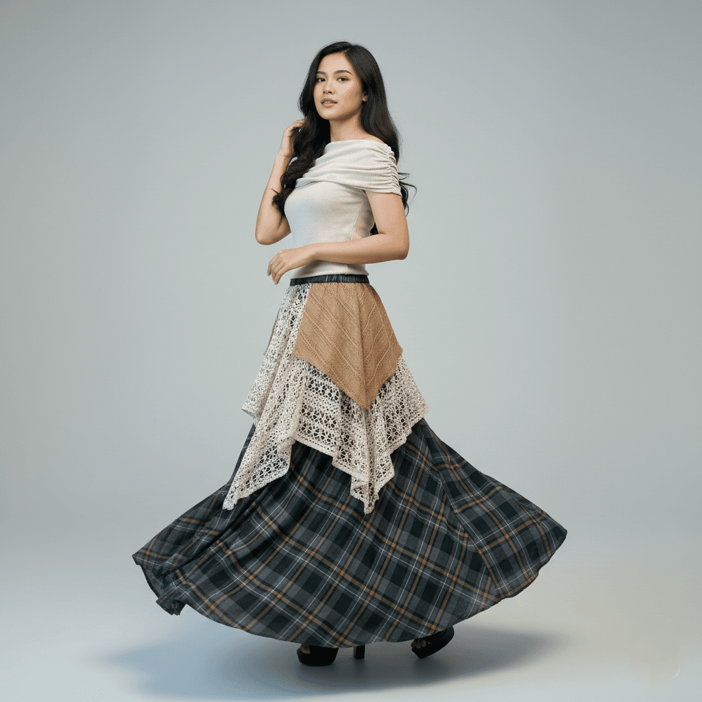 Tampil menawan dengan paduan unik gaya bohemian! Atasan rajut off-shoulder yang nyaman, dipadukan rok maxi kotak-kotak dengan detail renda rajut dan aksen etnik. Ideal untuk gaya santai nan chic, menonjolkan karakter Anda.